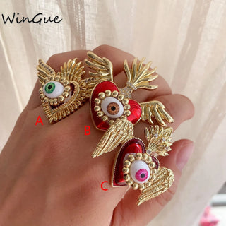 New Religious Rings Sacred Red Heart Wings Lucky Eye Rings Jewelry Cubic Zirconia Copper